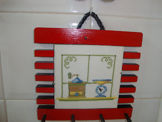 Ola pintei este chaveiro,e apliquei este ponto de cruz porque como é para por na cozinha achei bonito .Espero que gostem e deixem um comentario,para eu saber a vossa opinião.